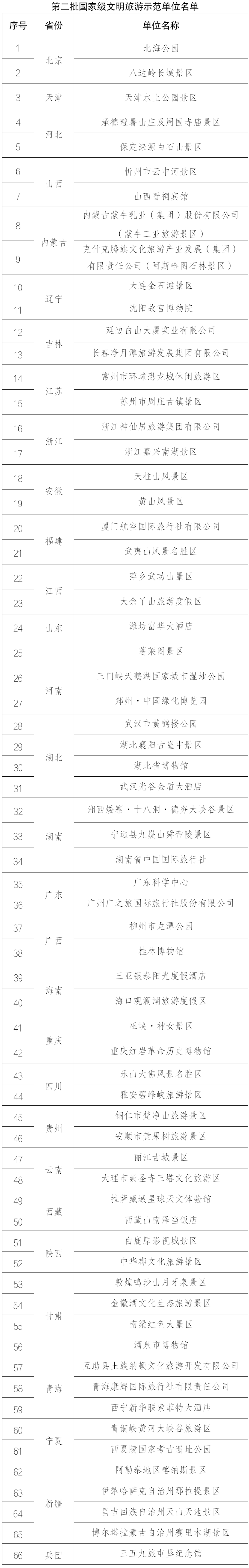 5月8日,文化和旅游部发布消息称,根据《文化和旅游部办公厅关于开展〈文明旅游示范单位要求与评价〉(LB/T 075-2019)实施工作的通知》,全国旅游标准化技术委员会认定,66家单位为第二批国家级文明旅游示范单位(包括2021年因疫情原因未开展实地评定的9家单位和2022年申报的57家单位)。具体名单如下: