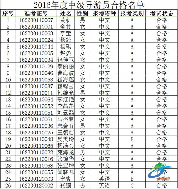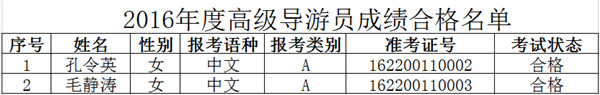 2016年度中、高级导游员合格名单